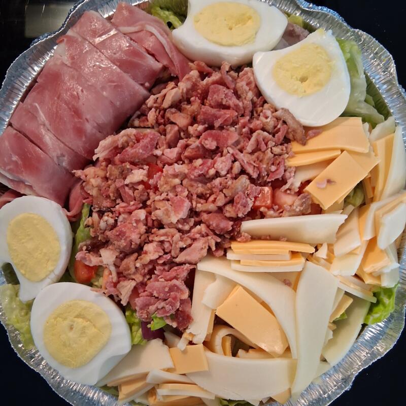 Lettuce, Tomato, Red Onion, Hard Boiled Eggs, Ham, Turkey, Bacon, American Cheese, & Provolone Cheese with your choice of dressing